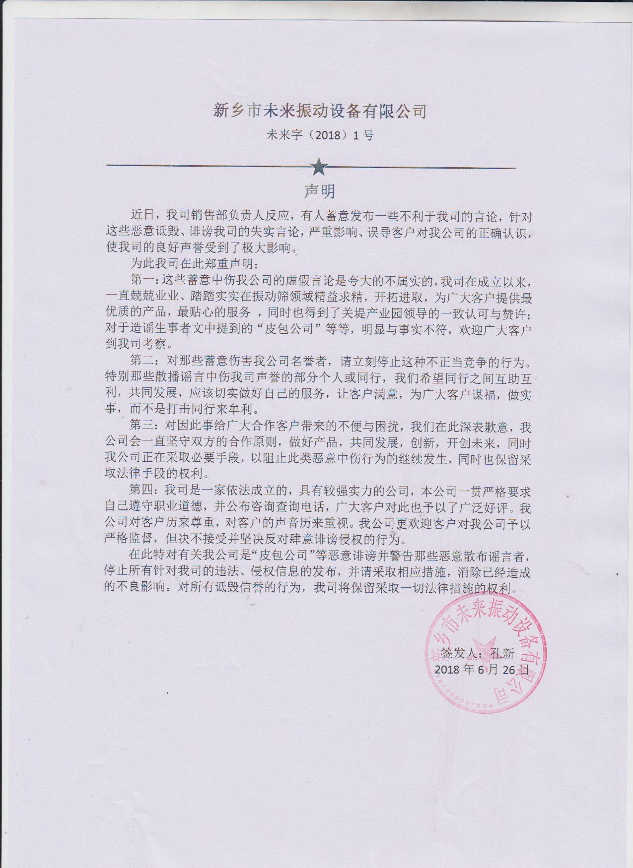 **:這些蓄意中傷我公司的虛假言論是夸大的不屬實的,我司在成立以來,一直兢兢業(yè)業(yè)、踏踏實實在振動篩領域精益求精,開拓進取,為廣大客戶提供**優(yōu)質的產品,**貼心的服務 ,同時也得到了關堤產業(yè)園領導的一致認可與贊許;對于造謠生事者文中提到的“皮包公司”等等,明顯與事實不符,歡迎廣大客戶到我司考察。