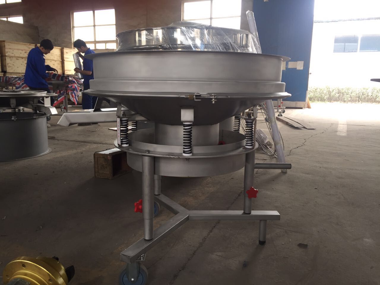如是激振器的原因,那就把偏心塊的重量增加,調(diào)節(jié)振幅;如是振動電機,振幅調(diào)節(jié)靠軸兩端的偏心塊夾角來改變激振力的大小,夾角小,激振力變大,振幅變大;反之,夾角變大,激振力變小,振幅變??;對軸偏心式振動器,可以增減配重飛輪和帶輪上的配重塊,以增減振動篩分機的振幅。激振器工作時偏心重量產(chǎn)生的離心力使偏心軸彎曲,導(dǎo)致軸承的內(nèi)套圈與外套圈的相對偏轉(zhuǎn),偏心會產(chǎn)生以轉(zhuǎn)頻及其各階諧頻而導(dǎo)致的振動,故運轉(zhuǎn)中產(chǎn)生的慣性力和慣性力偶將引起軸承的動反力和振動,破壞軸承等零部件的平穩(wěn)工作狀態(tài),產(chǎn)生高頻震動。經(jīng)過未來振動工程師研究分析表明,在振動篩激振器的軸承振動頻率和設(shè)備篩箱彈性振動的某一階段固有頻率相同時,就會引起振動篩的篩箱彈性體的強烈振動。軸承主動軸與從動軸系統(tǒng)均存在某一數(shù)值的共振頻率,如果有一些激振頻率與共振頻率接近,則發(fā)生共振。另外,由于偏心存在離心慣性力時,因此會產(chǎn)生彎曲振動,假如當轉(zhuǎn)速接近臨界值,則發(fā)生彎曲共振。